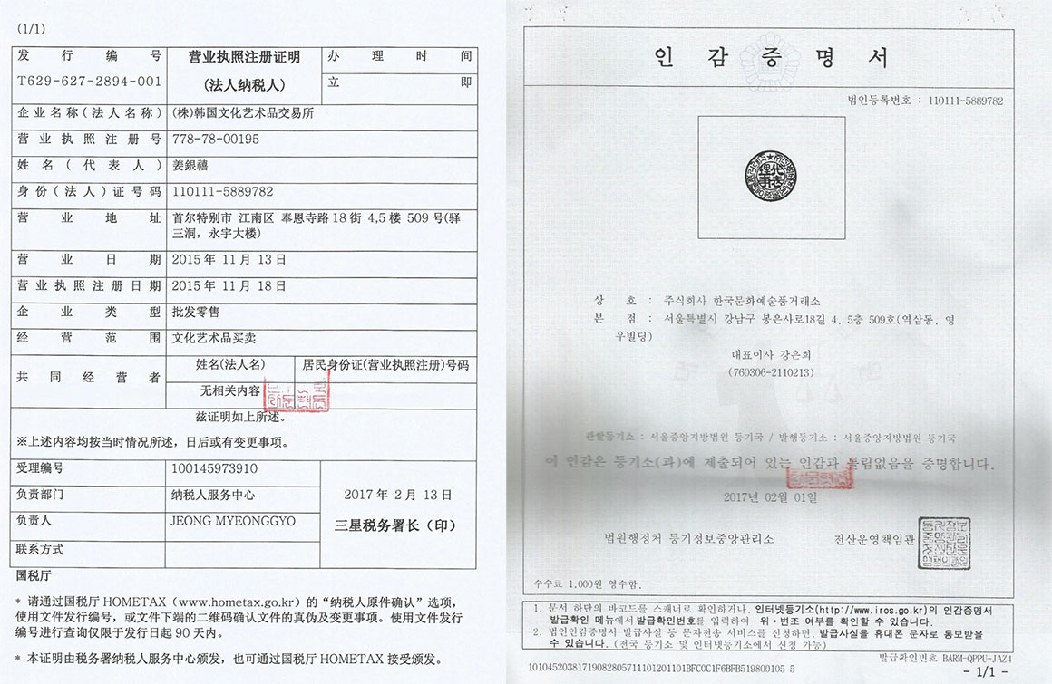 韓國文化藝術品交易所于2015年11月13日成立, 主要經營范圍:文化藝術品交易(郵票,貨幣,美術品等)、文化藝術品進出口(郵票,貨幣,美術品等)、電子商交易、網路購物網站、移動App開發、娛樂產業、海外觀光業、海外投資及眾籌、房地產開發、有關服務行業、有關批發零售、有關進出口業務、有關附帶事業等。